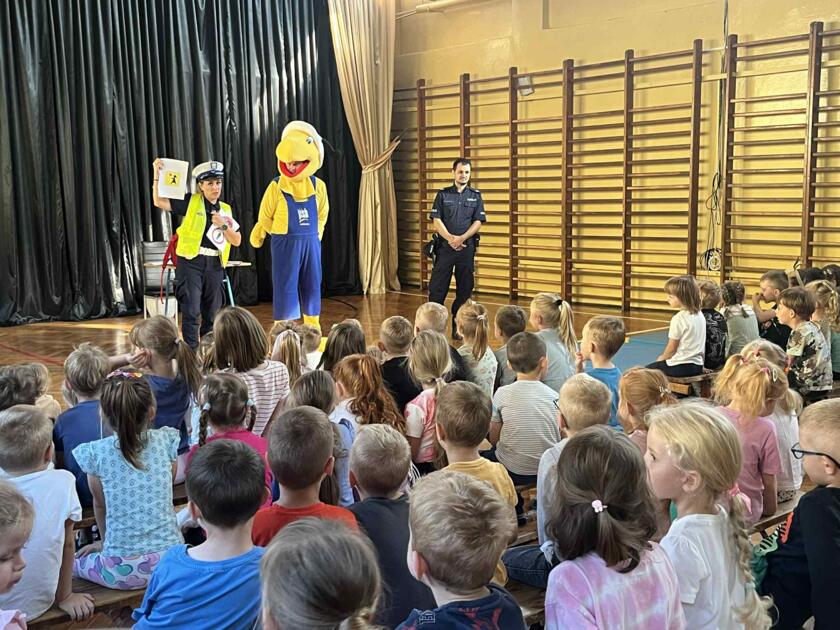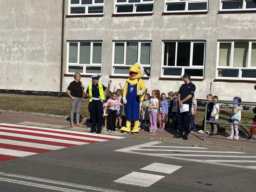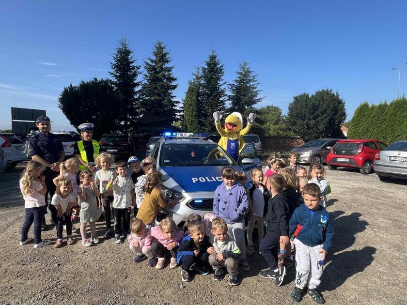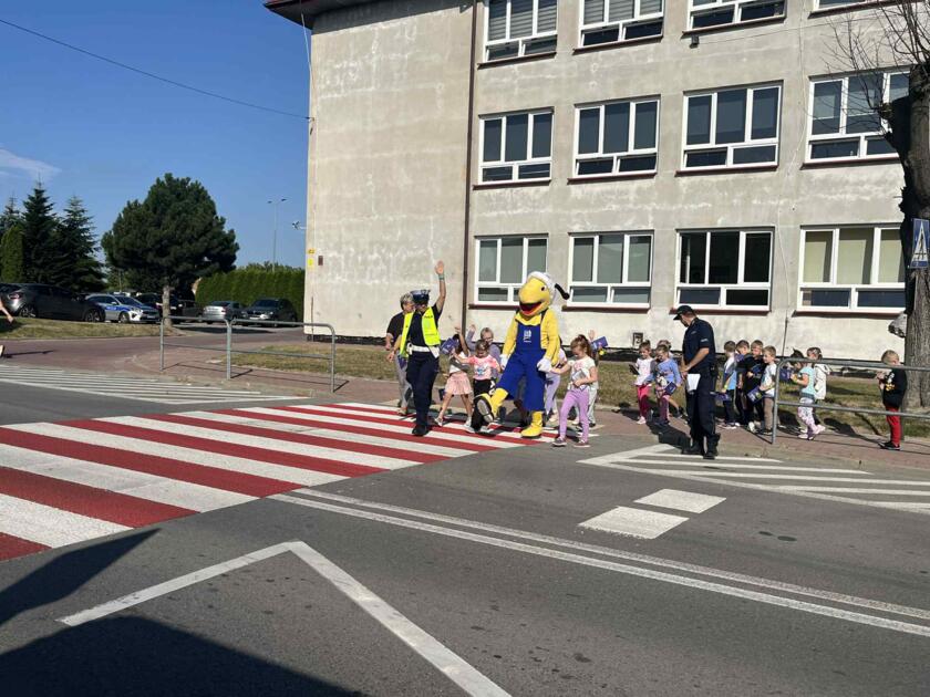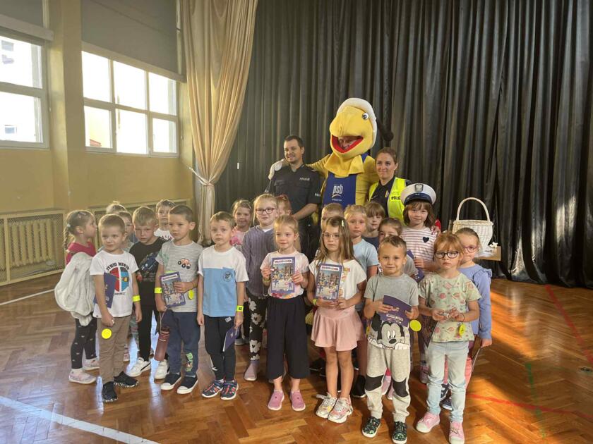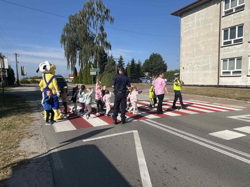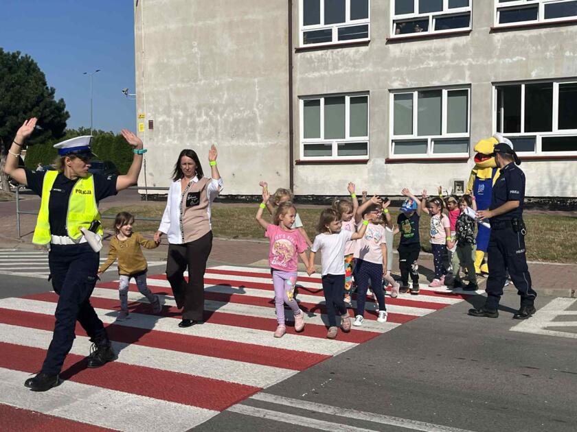 Przedszkolaki brały udział na świeżym powietrzu w nauce przejścia przez pasy na drugą stronę jezdni wraz z policją i maskotką mrówki.