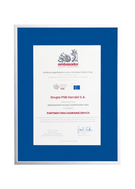 Grupa PSB Handel S.A. została uhonorowana tytułem „Ambasadora Polskiej Gospodarki” w kategorii „Partner firm zagranicznych” w tegorocznej edycji konkursu organizowanego przez Business Centre Club.