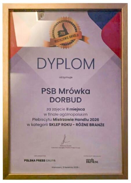 Podczas ogólnopolskiej gali finałowej plebiscytu Mistrzowie Handlu 2026, która odbyła się 19 kwietnia w Teatrze 6. Piętro w Warszawie, uhonorowano najlepsze sklepy i sprzedawców z całej Polski. Wśród laureatów znalazła się PSB Mrówka DORBUD w Niepołomicach, która zajęła II miejsce w kategorii „Sklep Roku – Różne Branże”.