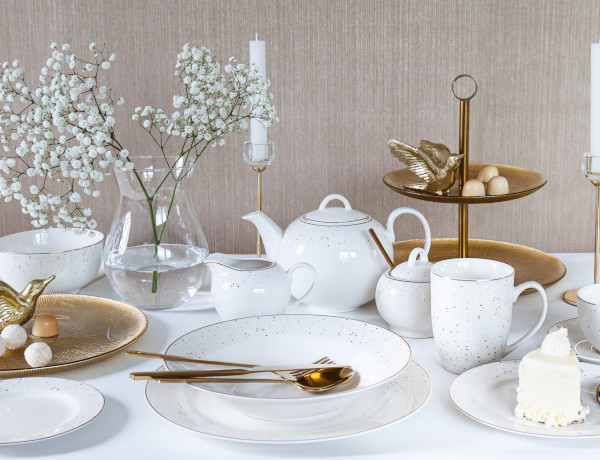 Kolekcja AURELIA od Ambition to elegancka porcelana zdobiona subtelnymi, złotymi akcentami – idealna na świąteczny stół. Biała, klasyczna forma w połączeniu ze złotymi detalami pięknie komponuje się ze świątecznymi dekoracjami i blaskiem świec.