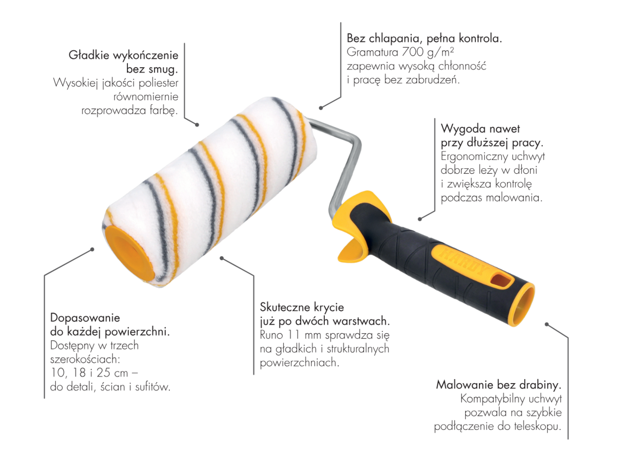 Poszycie z trwałego mikrowłókna (gramatura 700 g/m²) skutecznie chłonie farbę i oddaje ją bez smug, zacieków i pęcherzyków.
