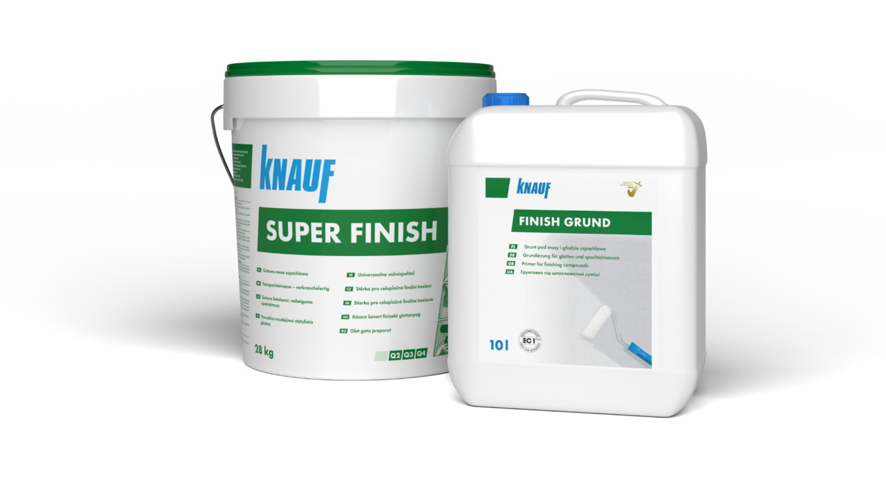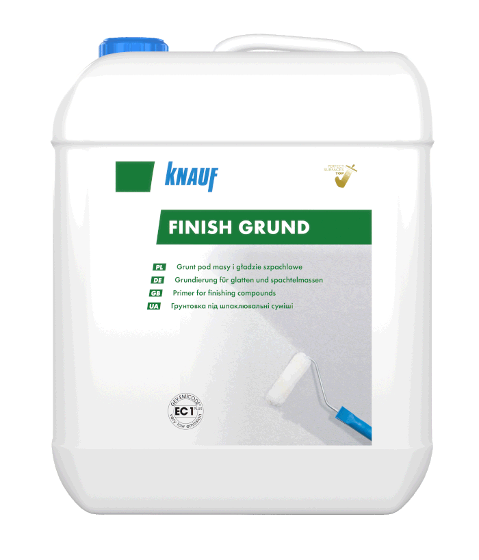 Aby masa szpachlowa Knauf Super Finish mogła pokazać pełnię swoich możliwości, potrzebuje odpowiedniego przygotowania podłoża. Knauf Finish Grund to grunt, który zwiększa przyczepność i trwałość wykończenia. Knauf Finish Grund i Knauf Super Finish to niezawodny system, który zapewnia trwałość i estetykę na najwyższym poziomie. Grunt przygotowuje podłoże, a masa szpachlowa tworzy idealnie gładką powierzchnię.