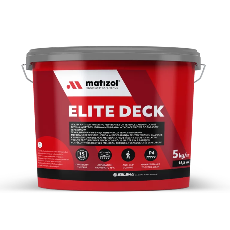 Hybrydowa, wzbogacona piaskiem kwarcowym, wodoodporna membrana wykończeniowa do dachów użytkowych, tarasów, balkonów, garaży i parkingów. MATIZOL ELITE DECK stanowi wierzchnią warstwę w systemie ELITE TECH w przypadku chęci uzyskania antypoślizgowego wykończenia powierzchni.