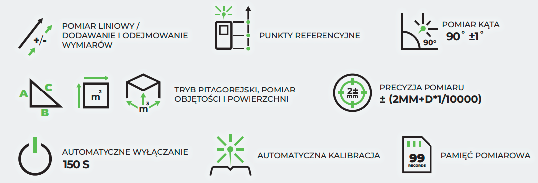 Dalmierz laserowy DLP200DG to nowoczesne narzędzie, które łączy precyzję, funkcjonalność i innowacyjne rozwiązania technologiczne. Dzięki zastosowaniu dwóch zielonych wiązek laserowych działających w dwóch kierunkach, DLP200DG umożliwia dokonywanie pomiarów z różnych pozycji, np. ze środka pomieszczenia lub wysokości, bez potrzeby schylania się, co znacząco zwiększa komfort pracy