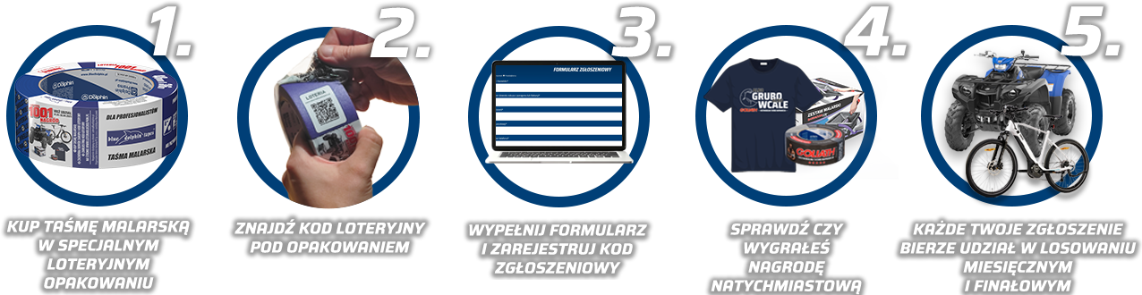 Jak wygrać nagrody? Kup taśmę malarską Blue Dolphin w specjalnym loteryjnym opakowaniu i weź udział w loterii! Zarejestruj swój kod i paragon na stronie loteriabluedolpin.pl. Czekają na Was nagrody natychmiastowe dzienne i tygodniowe, co miesiąc rowery, a na koniec nagroda główna - quad YAMAHA KODIAK 450 FWBD! Dowiedz się więcej jak wziąć udział w loterii - nagroda główna może być właśnie Twoja!