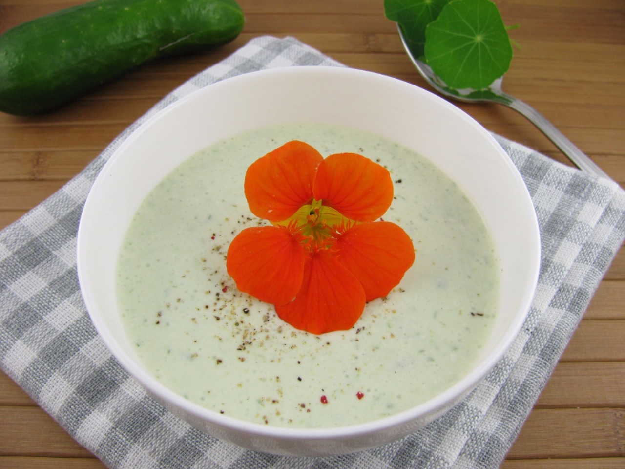 Na lato proponujemy lekką, łatwą sałatkę z tą dekoracyjną rośliną, w sam raz na przyjęcie grillowe. Kwiaty nasturcji doskonale komponują się z zielonym ogórkiem. Dlatego podstawą sałatki jest zielony ogórek szklarniowy. 2 ogórki myjemy, pozostawiamy ze skórką, i kroimy w grubą wyraźna kostkę. 1 cebulkę cukrową kroimy w piórka i zalewamy 3 łyżeczkami świeżo wyciśniętego soku z cytryny. Łączymy zmaserowaną cebulkę z ogórkiem, dodajemy świeżo ugotowany, wystudzony i obrany bób (ok. 0,5 kg), tak by stanowił mniej więcej 3/4 ilości z ogórka. Przygotowujemy słodkawo-winny dresing – vinegrett: 3 łyżeczki octu winnego, 5 łyżeczek oliwy, 1,5 łyżeczki cukru, szczypta soli, szczypta pieprzu, pół łyżeczki musztardy dijone, opcjonalnie wyciśnięty ząbek czosnku. Mieszamy dressing (najlepiej do uzyskania lekko zawiesistej konsystencji), zalewamy i mieszamy delikatnie wszystkie składniki sałatki. Na wierzchu układamy kwiaty nasturcji, na przemian z jej małymi listkami. Sałatka mimo nieoczywistych smaków jest wyśmienita i doskonale pasuje do mięs z grilla.