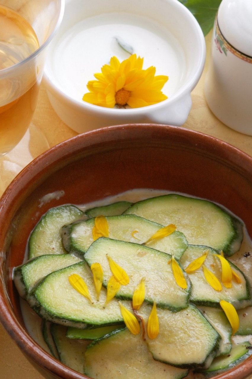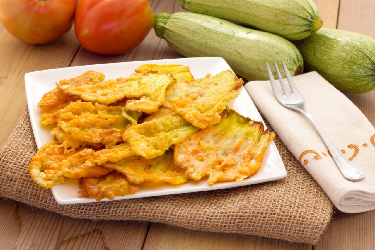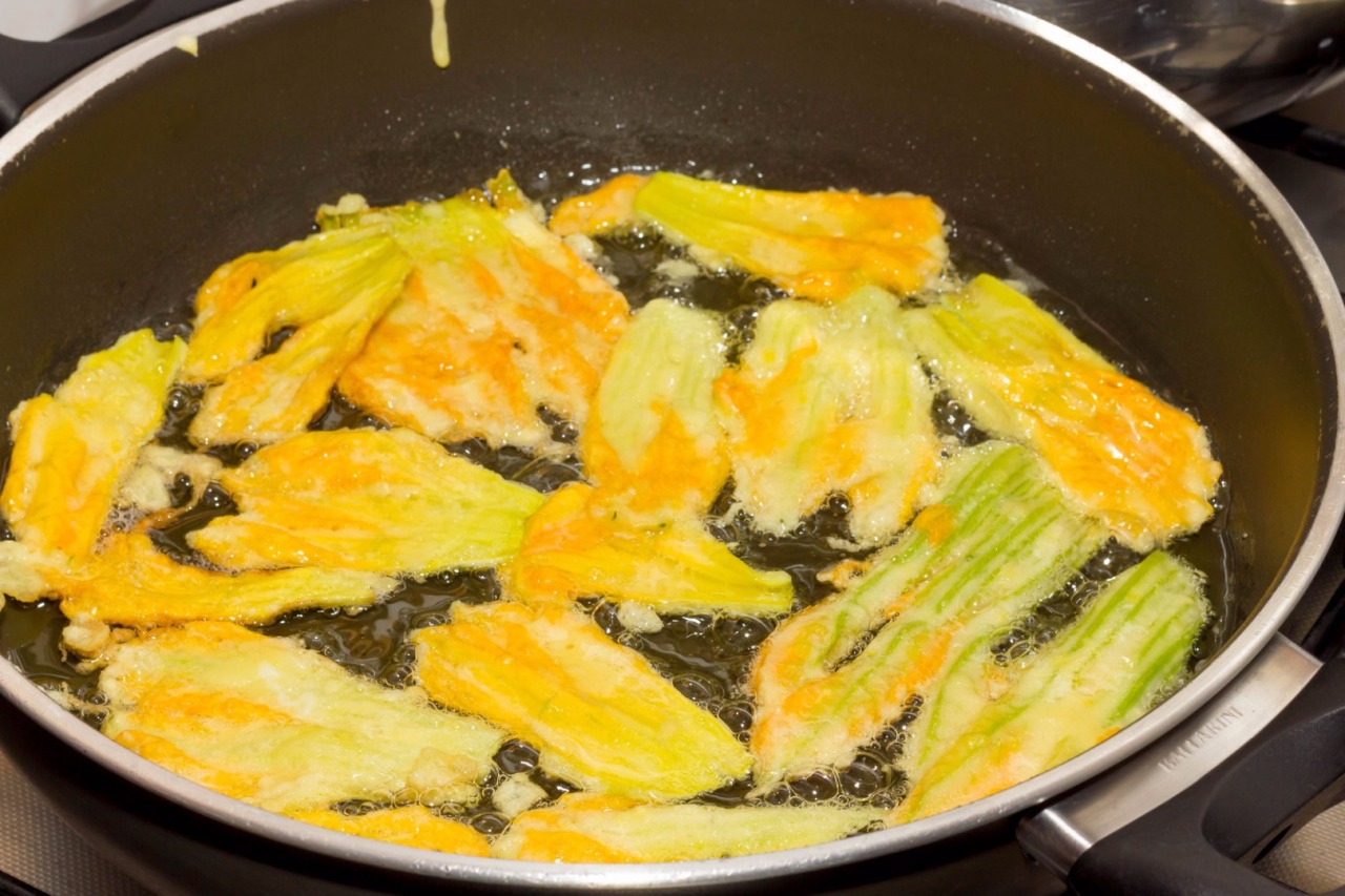 Kwiaty cukinii delikatnie płuczemy i osuszamy na papierowym ręczniku. W tym czasie przygotowujemy wytrawne ciasto naleśnikowe: 2 szklanki mąki (można 1 szklankę mąki pszennej zamienić na szklankę mąki kukurydzianej dla ciekawszego smaku), 1 szklanka mleka, 1 szklanka wody mineralnej gazowanej (można zastosować 1/2 wody gazowanej, 1/2 jasnego piwa), 2 jajka, szczypta soli. Składniki mieszamy blenderem na jednolitą konsystencję. Na patelni rozgrzewamy oliwę do smażenia. Każdy kwiat delikatnie obsypujemy mąką i zanurzamy w cieśnie naleśnikowym, a następnie kładziemy na patelni, smażymy krótko z jednej i drugiej strony na delikatnie rumiany kolor. Smażone kwiaty cukinii smakują z delikatnym kremem twarogowym i słodko-winną sałatką ze świeżego ogórka (np. z nasturcją).