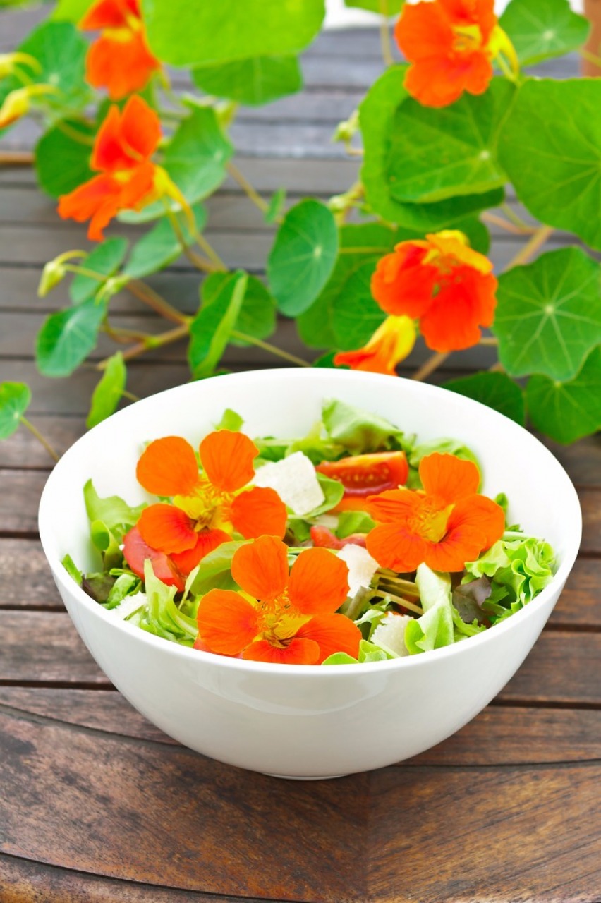 Nasturcja ma wyjątkowo urodziwe kwiaty, wyraźne, duże kielichy w różnych odcieniach pomarańczu. Kwiaty te mają też ciekawy cierpkawo-ostry smak, są dość soczyste o wyraźnym aromacie przypominającym rzeżuchę. Dlatego kwiaty, ale też i liście nasturcji doskonale pasują do potraw wytrawnych, ale świeżych oraz rześkich. Kwiaty nasturcji są dobrym, pikantnym uzupełnieniem sałatek, warto więc je dawać jako smaczne wykończenie potrawy.