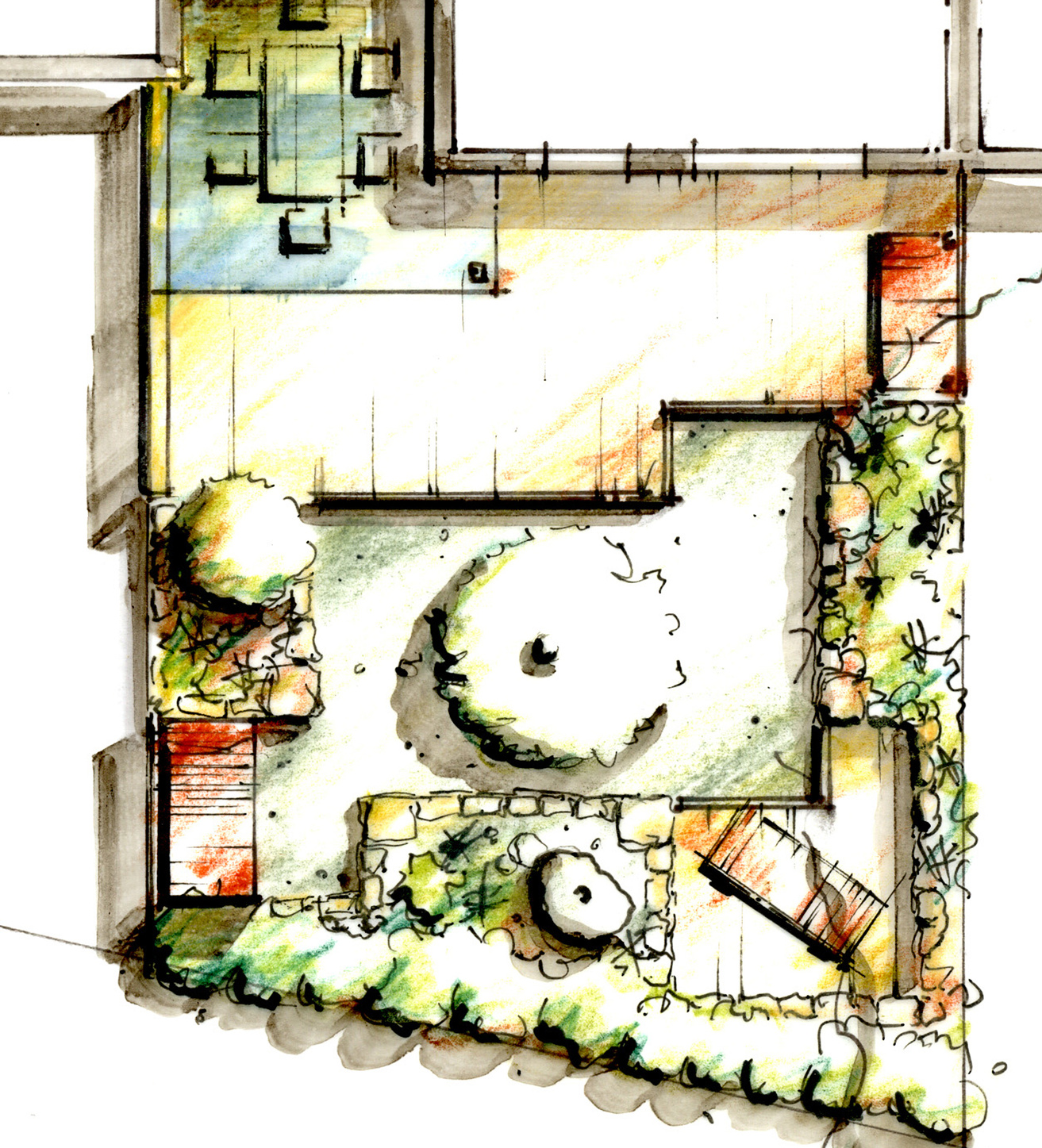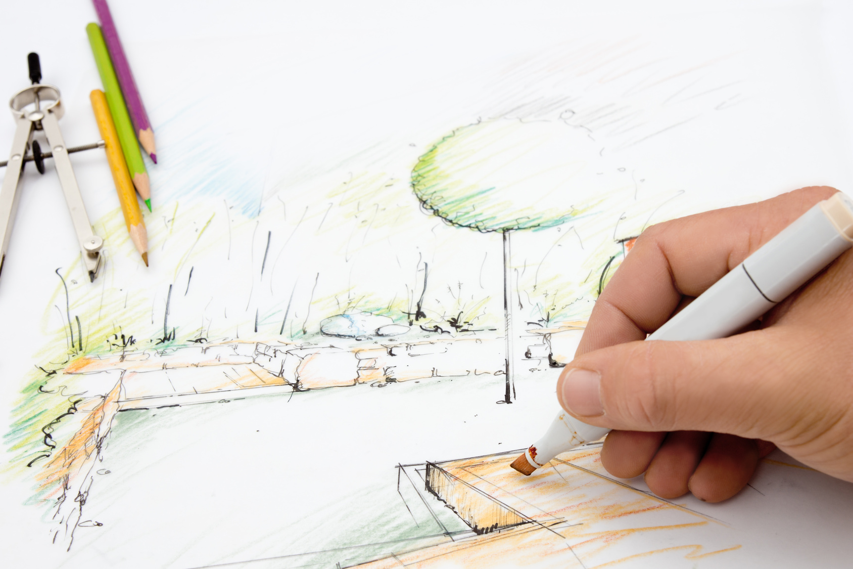 Wykonując szkic – najlepiej rzut z góry – warto używać kolorów imitujących kolorystykę odmian w ich najbardziej efektownym kwitnieniu, ulistnieniu i rozroście. Pozwoli to na wyobrażenie sobie, jakich efektów barwnych możemy się spodziewać. Może nam to też znacznie pomóc na etapie koncepcyjnym w budowaniu stref jednobarwnych czy kontrastowych.