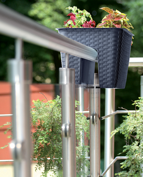 Bardzo wygodnym rozwiązaniem są gotowe dwudzielne doniczki, doskonale nadające się do umieszczenia na poręczy balkonu czy balustradzie tarasu. Są to pojemniki z tworzywa, dwudzielne, symetryczne względem siebie, skonstruowane tak, aby po wypełnieniu ziemią utrzymywały się stabilnie przewieszone przez poręcz (zwykle wyposażone są dodatkowo w ograniczniki stabilizujące pojemnik na balustradzie). Producenci oferują różne fasony oraz różną kolorystykę i fakturę pojemników. Bez trudu dobierzemy model pasujący stylem i wymiarem do naszych warunków. Kwiaty w takich pojemnikach prezentują się atrakcyjnie, możemy je zestawiać ze sobą, tworząc bardziej gęstą lub rzadszą wiszącą kwiatową rabatę. Wśród oferowanych na stoiskach ogrodowych modeli będą zarówno te niewielkie na pojedyncze rośliny, jak i duże spełniające bez trudu rolę skrzynki, w której możemy sadzić różne odmiany kwiatów, a także uprawiać truskawki i zioła.
