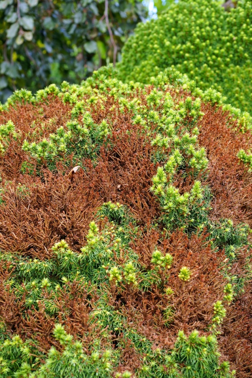 Może zdarzyć się, że krzewy iglaste zaczynają schnąć i przebarwiać się manifestując tym brak odpowiednich składników mineralnych (dotyczy to głównie magnezu). Jako że iglaki to rośliny głównie kwasolubne może okazać się, że gleba, w której są posadzone jest zbyt zasadowa lub jałowa. Warto zatem latem wraz z regularnym podlewaniem odżywić rośliny, podając odpowiednio zbilansowany nawóz do iglaków i obserwować, czy ich stan się poprawia.