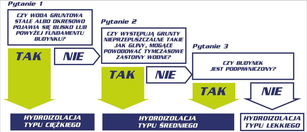 Jeśli choć na jedno z tych pytań odpowiedź brzmi 'tak', zalecane jest zastosowanie izolacji przeciwwodnej. Jeśli na wszystkie pytania padła odpowiedź ‘nie’ – można zdecydować się na izolację przeciwwilgociową. Jednak decyzja o zastosowaniu izolacji cienkopowłokowej wiąże się z ryzykiem, ponieważ może ona w łatwy sposób ulec uszkodzeniu pod wpływem parcia wody gruntowej lub działania gromadzącej się wody opadowej. Dodatkowo zmienne warunki wodno-gruntowe mogą sprawić, że izolacja przeciwwilgociowa w pewnym momencie stanie się niewystarczająca.
