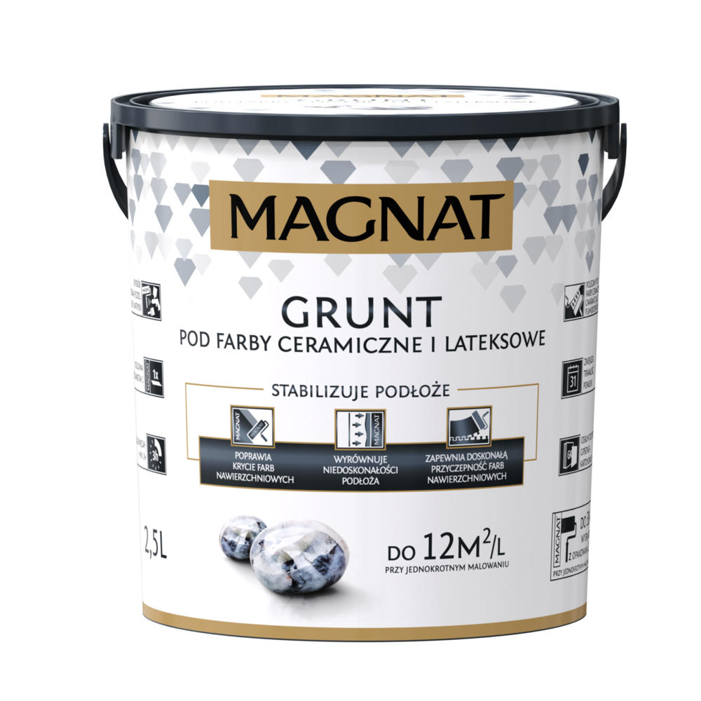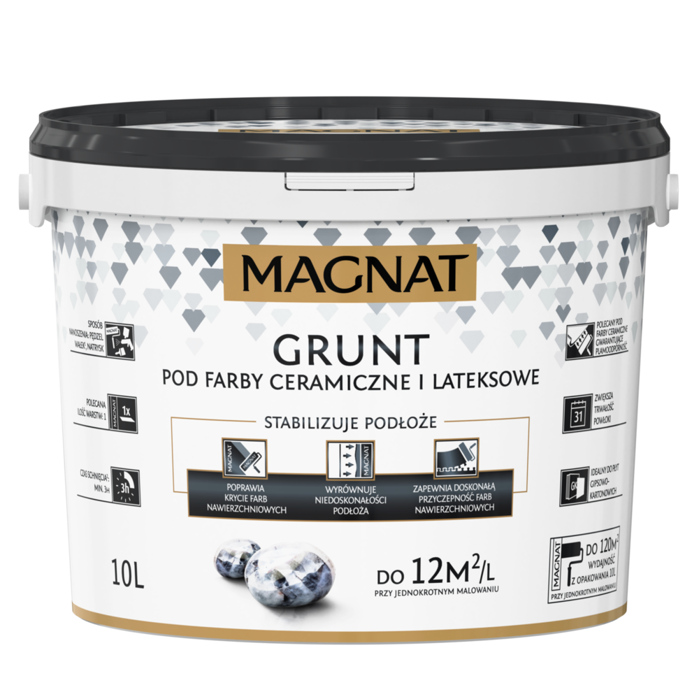 Bez względu na to, czy planujemy metamorfozę już użytkowanego salonu, czy też urządzamy go od podstaw w nowym mieszkaniu, prace zaczynamy zazwyczaj od przemalowania ścian. W pierwszej kolejności trzeba je oczyścić, odkurzyć i odtłuścić, a w razie potrzeby wszelkie ubytki wypełnić przy pomocy specjalnej masy szpachlowej (wówczas szlifujemy i dokładnie odpylamy powierzchnię). Następnie przechodzimy do aplikacji farby podkładowej, dzięki czemu będziemy mieć pewność, że farba nawierzchniowa równo pokryje ściany i zapewni ich trwałe, estetyczne wykończenie. W tej roli bardzo dobrze sprawdzi się MAGNAT Grunt, który dodatkowo stabilizuje podłoże i wyrównuje jego niedoskonałości (ujednolica fakturę), zwiększając wydajność oraz trwałość wyrobów nawierzchniowych. MAGNAT Grunt nakładamy zgodnie z zaleceniami producenta, w jednej warstwie.