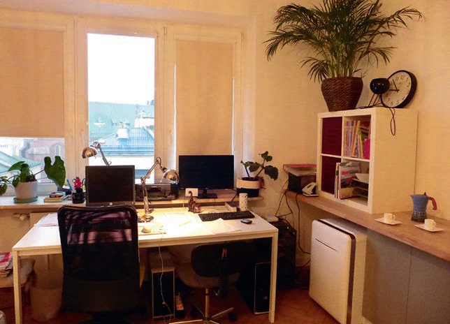 Neutralne, ale też pozostawiające pole do uzupełnienia własnymi sprzętami najemców wykończenie okazało się świetnym rozwiązaniem również wtedy, gdy do właściciela zgłosili się potencjalni najemcy z pomysłem urządzenia w kawalerce małego biura. Niewielka agencja wydawnicza potrzebowała miejsca do pracy dla trzech, czasami czterech osób. Szybkie oględziny i parę niezbędnych pomiarów zakwalifikowały kawalerkę jako lokum spełniające oczekiwania zespołu. Pustą przestrzeń pod oknem natychmiast zagospodarowano na miejsce do pracy – stanął tam długi stół, przy którym urządzono stanowiska komputerowe dla dwóch osób. Szeroki parapet również posłużył celom biurowym – to idealne miejsce na ustawienie ekranu stacjonarnego komputera oraz drukarki. Wolna przestrzeń pod kuchennym blatem okazała się najlepszym miejscem na serwer, a sam blat na ustawienie podręcznego regału, niezbędnego do przechowywania segregatorów i innych materiałów biurowych. Ograniczony do minimum aneks kuchenny z powodzeniem zaspokaja potrzeby niewielkiego, działającego jedynie kilka godzin dziennie biura. Nikt też nie narzeka na małą umywalkę w łazience – przecież służy ona wyłącznie do mycia rąk. Ekonomiczne podejście do przestrzeni sprawiło, że w części aneksu kuchennego, gdzie pod blatem zamontowana jest pralka, postawiono regał na książki i gazety – dostęp do pralki nikomu nie jest przecież potrzebny! Wymiary stołu służącego jako biurko pozwoliły zachować swobodny dostęp do wbudowanej szafy, która stała się biurowym magazynem. Trzecie stanowisko pracy, w założeniu traktowane było raczej jako ”gorące biurko” dla osób, które w danym momencie nie potrzebują dostępu do stacjonarnego komputera i są w stanie pracować na laptopie. Niezbyt szerokie stylizowane biurko wypełniło przestrzeń między pięknym eklektycznym lustrem zamontowanym przy drzwiach a kanapą. Ale po co w biurze kanapa? Jej obecność poddawana była dyskusji i właściciel mieszkania gotów był ją zabrać, jednak ostatecznie uznano ją za niezbędny sprzęt w chwilach narad i „burz mózgu” zespołu, które są niezbędnym elementem jego pracy.
