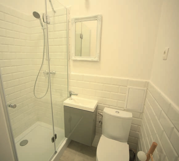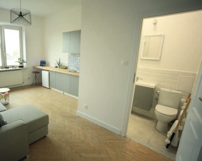 Pierwotnym zamysłem było, by lokal służył przede wszystkim celom mieszkalnym. Położenie w pobliżu kilku uczelni gwarantowało zainteresowanie najmem przede wszystkim u młodych ludzi, ale styl mieszkania i jego wyposażenie miały być jak najbardziej uniwersalne. Kluczem w takich przypadkach jest dobra baza – tutaj okazał się nią stary dębowy parkiet ułożony w jodełkę, który stał się dobrym tłem dla innych materiałów i wyposażenia. W małym mieszkaniu szczególnie trzeba zadbać, aby aranżacja była spójna – nadmiar materiałów i kolorów sprawia wtedy wrażenie chaosu oraz zacieśnia i tak małą przestrzeń. Zastosowano więc sprawdzoną zasadę ograniczenia liczby materiałów i użytych kolorów do minimum. Jasne drewno powtórzono na kuchennym blacie, w kuchni i łazience zastosowano ten sam kształt płytek ceramicznych – modną, a zarazem neutralną estetycznie cegiełkę, różnicując jedynie jej kolorystykę. Dzięki jasnym kolorom i ograniczeniu okładzin z płytek do miejsc narażonych na styczność z wodą, mieszkanie wydaje się bardziej przestronne i optycznie większe. Wyposażono je tylko w niezbędne do mieszkania sprzęty: rozkładaną kanapę, komodę na bieliznę i drobiazgi. Blat kryjący szafki w kuchennym aneksie zamontowano na całej długości ściany – w części, w której nie ma pod nim szafek może posłużyć jako barek do spożywania posiłków czy jako blat do pracy. Takie neutralne wykończenie i ograniczone do minimum wyposażenie jest jednocześnie doskonałą bazą do uzupełnienia indywidualną aranżacją przez każdego z najemców – można ją wzbogacić dodatkowymi sprzętami czy kolorami, uzyskując w ten sposób własne, spersonalizowane wnętrze.