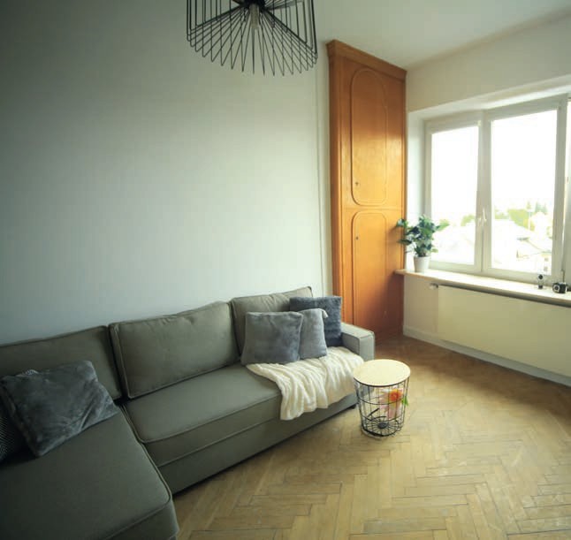 Kawalerka została wydzielona z większego mieszkania, które na pewnym etapie życia okazało się dla rodziny zbyt obszerne. 22-metrowy pokój przekształcono w osobny, jak się okazało, bardzo funkcjonalny lokal. Było to możliwe nie tylko dzięki bliskości pionów instalacyjnych niezbędnych do urządzenia kuchni i łazienki, ale również odpowiedniemu kształtowi pokoju. Zbliżone do kwadratu, szerokie pomieszczenie pozwoliło na wygospodarowanie łazienki bez straty dla wygody w strefie wejścia oraz aneksu kuchennego, który nie uszczuplił nadmiernie przestrzeni wypoczynkowej mieszkania. Trzyskrzydłowe okno doskonale oświetla całą przestrzeń, a dzięki panoramicznemu widokowi wzmacnia wrażenie przestronności mieszkania.