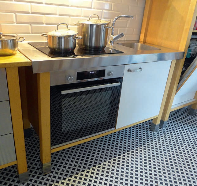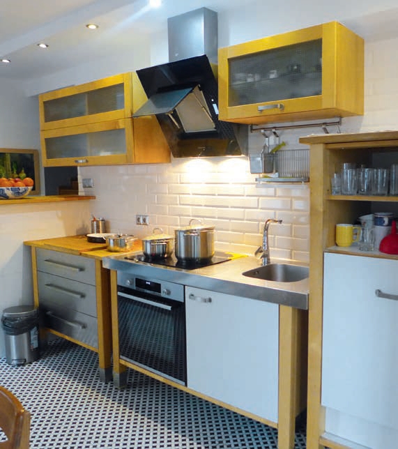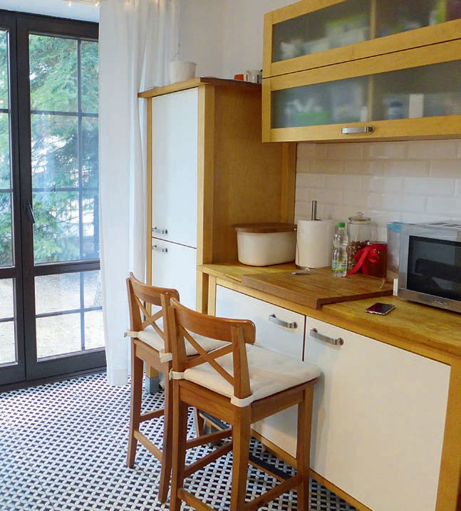 Oryginalne wykończenie i wyposażenie podkreśliło te atuty, a ostatnio przeprowadzony remont dodał jej jeszcze klasy. Podstawą wyposażenia jest nietypowa zabudowa kuchenna – to wolno stojące szafki, które mimo okazałych gabarytów mają dość lekki wygląd. Każdy moduł jest osobnym funkcjonalnie stanowiskiem pracy, wyposażonym we własny blat. Mimo upływu lat design szafek przetrwał próbę czasu – meble wciąż zachwycają oryginalnością i nadają kuchni indywidualny charakter. Szafki odznaczają się też solidnym wykonaniem – to również powód, dla którego podczas remontu kuchni właściciele postanowili ich nie wymieniać. Pod młotek natomiast poszły ściany i posadzka. Wybór nowych okładzin nie był łatwy – ujawnił mocno odmienne gusta domowników.