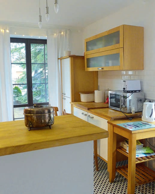 Kuchnia w domu jednorodzinnym ma tę przewagę nad mieszkaniem w bloku, że można ją lepiej powiązać z otoczeniem. Atut ten postanowili wykorzystać państwo Grażyna i Bogumił, kiedy przed ponad już 20 laty budowali swój dom. Przyszłym właścicielom zależało, aby budynek miał jak najwięcej miejsc wiążących go z ogrodem i otaczającym posesję lasem. Obydwoje mieli głębokie przekonanie, że tylko wtedy różnica między mieszkaniem w bloku, a domem będzie warta ponoszenia trudów budowy. Spośród wielu wówczas projektów gotowych dosłownie wyłuskali ten, w którym każde pomieszczenie parteru – kuchnia, jadalnia i salon – miało swoje własne wyjście do ogrodu. Pozostałe liczne okna miały ponadstandardową wysokość, co pozwoliło na nietypowe wówczas niskie usytuowanie parapetów. Szczególnie kuchnia z szerokim dwuskrzydłowym oknem balkonowym to było to! Perspektywa pietruszki do rosołu z własnej grządki i to na wyciągnięcie ręki była mocno przemawiająca. Choć kuchnia jest pomieszczeniem niewielkim, to dzięki wręcz zalewającemu ją naturalnemu światłu oraz wnikającej do wnętrza zieleni jest bardzo atrakcyjnym miejscem w domu.