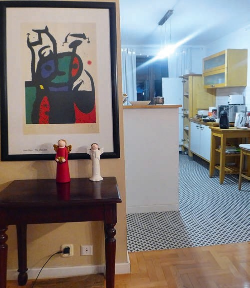 Po wielu debatach gospodarze postawili na klasykę. Miejsce białej glazury w popartowski czarno-żółty wzór zajęła ponadczasowa biała cegiełka, beżową terakotę na posadzce zastąpiono gresem z klasycznym czarno-białym motywem opartym na geometrycznej grafice. Drobny, niemal mozaikowy deseń został naniesiony na płytki o dużych formatach – 44x44 cm. Z jednej strony to świetne nawiązanie do czarnej mozaiki, którą wykończono czołowe ścianki murków, z drugiej drobny wzór stanowi dobry kontrast dla białej płaszczyzny ścian i frontów szafek. Jest to również dobre tło dla jasnego drewna korpusów mebli. Po remoncie kuchnia stała się jeszcze bardziej powiązana z pozostałą częścią strefy dziennej – nową posadzkę przeciągnięto do holu i wiatrołapu.
