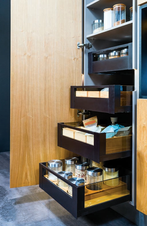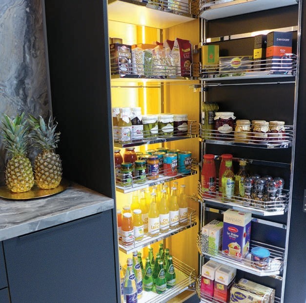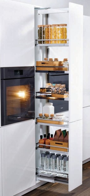 To najbardziej obszerna spiżarnia spośród wszystkich systemów na rynku! System swoim wyglądem przypomina układ półek występujący w lodówce – można je układać na drzwiach i wewnątrz systemu. Pozwala na uporządkowanie w jednym miejscu wszystkich produktów, które nie wymagają chłodzenia – jest to możliwe dzięki szerokim półkom, których zawartość jest doskonale widoczna. Po otwarciu wewnętrzne półki przesuwają się do przodu, co ułatwia przeglądanie zawartości, pakowanie i wyciąganie produktów. To rozwiązanie ergonomiczne – wewnętrzne półki łatwo się przesuwają, a wysunięcie obciążonego systemu nie wymaga dużego wysiłku. Półki udźwigną obciążenie nawet do 80 kg, a relingi koszy sprawiają, że produkty nie przewracają się podczas wysuwania.