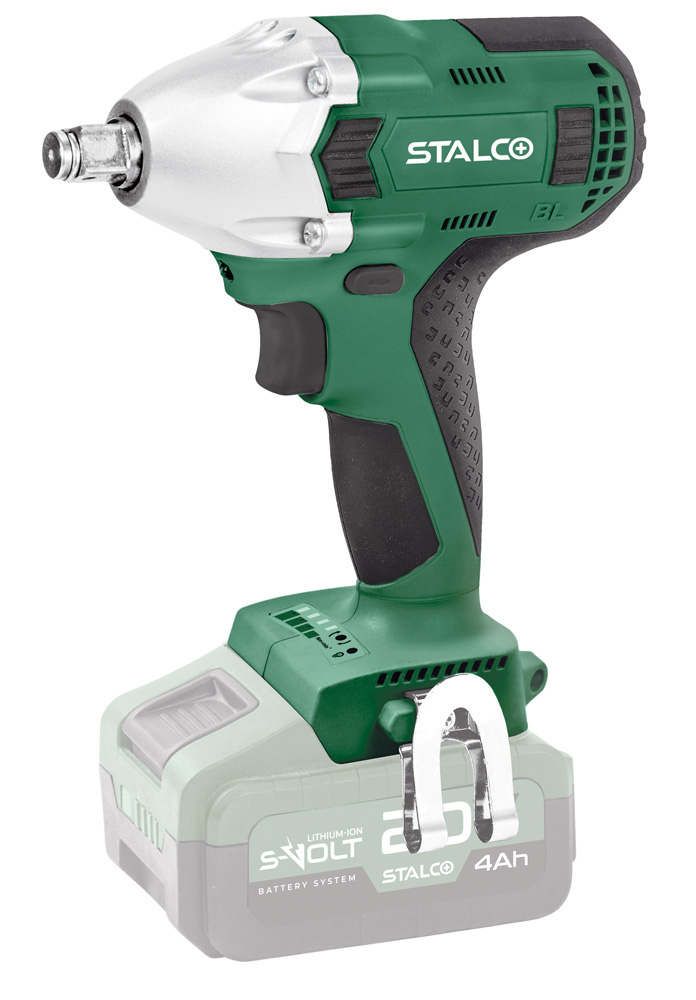 Klucz udarowy ma silnik bezszczotkowy o dużej żywotności, który dodatkowo ogranicza zużycie energii. Dzięki systemowi S-Volt, można zasilać go akumulatorami z innych urządzeń STALCO. W kluczu zastosowano funkcję dodatkowego oświetlenia z wykorzystaniem trzech diod, dlatego praca w trudno dostępnych miejscach staje się łatwiejsza. Na komfort obsługi wpływa także przejrzysty panel sterowania i automatyczne zabezpieczenie przed przegrzewaniem.