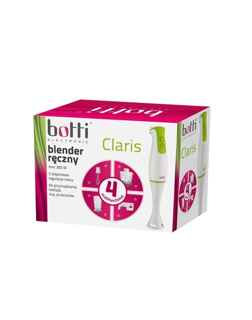 Blender Claris w zestawie HB1902-C marki BOTTI to urządzenie, które idealnie sprawdzi się w Twojej kuchni. Dzięki niemu z łatwością zmiksujesz owoce, warzywa czy potrawy dla dzieci i nie tylko. Blender ręczny Claris pozwala rozdrabniać, przecierać oraz w łatwy sposób przygotowywać wszelkiego rodzaju zupy krem, musy, pure oraz inne potrawy wymagające podobnej konsystencji. Końcówka blendera została wykonana z wytrzymałej stali nierdzewnej, co gwarantuje możliwość jej długotrwałego użytkowania. Całość powleczona jest odpornym na uszkodzenia mechaniczne i łatwym w utrzymaniu czystości białym tworzywem sztucznym. Blender jest bardzo wygodny w użytkowaniu. Ma ergonomiczny uchwyt. Nie zajmuje dużo miejsca i jest niezwykle funkcjonalny. Urządzenie sprawdzi się nie tylko jako blender, ale także jako siekacz i ubijacz. To niezastąpione wyposażenie każdej kuchni.