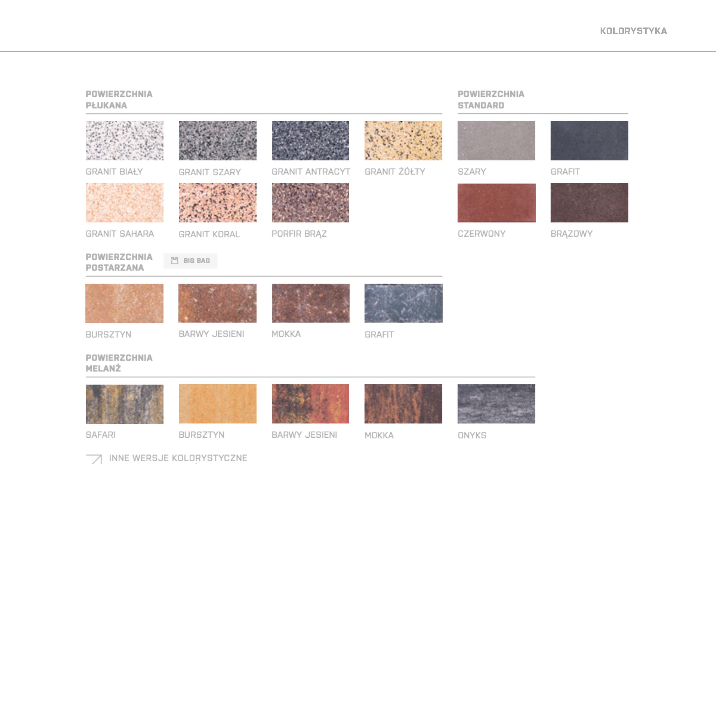 Klasyka formy dla tych, którzy doceniają prostotę i elegancję. Produkty posiadają siedem różnych kształtów, tworzących system, który doskonale wpisze się w projektowany obszar. Dzięki płaskiej powierzchni i minimalnej fudze tworzy nawierzchnie o wyjątkowym komforcie użytkowania./ Dostępne powierzchnie : / pow. płukana : granit biały, granit szary, granit antracyt, granit żółty, granit sahara, granit koral, porfir brąz / pow. melanż : safari, bursztyn, barwy jesieni, mokka, onyks / pow. standard : szary, grafit, czerwony, brązowy / pow. postarzana : bursztyn, barwy jesieni, mokka, grafit