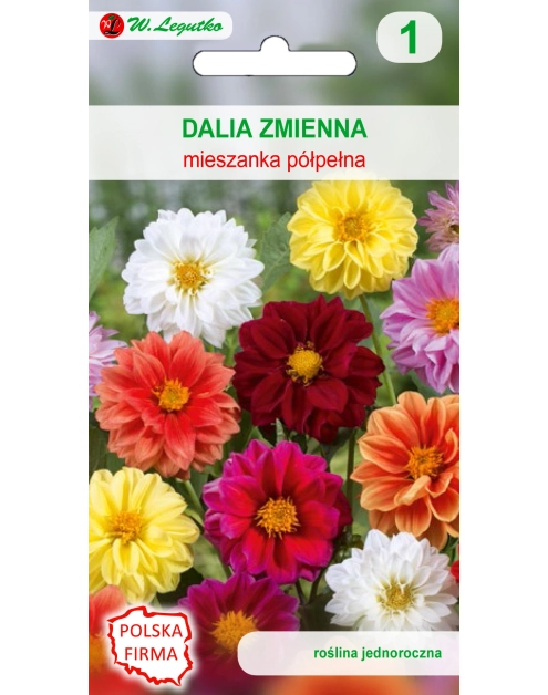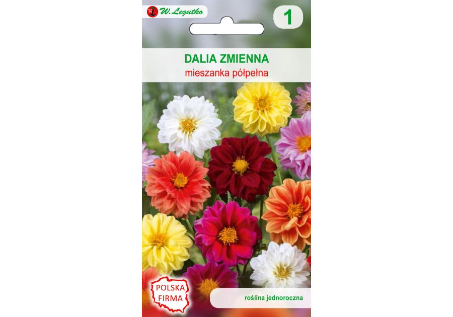 Mieszanka nasion dalii karłowatej z serii W.Legutko. Piękna, jednoroczna roślina polecana do uprawy na rabatach lub w donicach. Wyróżnia się półpełnymi kwiatostanami o intensywnym zabarwieniu – żółtym, pomarańczowym, ciemnoczerwonym, różowym. Wysiew do doniczek lub na palety w kwietniu, wysiew do gruntu w końcu maja. Zalecana jest uprawa w miejscu suchym, słonecznym, w glebie żyznej i dobrze przepuszczalnej. Roślina osiąga ok. 40-50 cm wysokości. Dalia zmienna półpełna będzie pięknie prezentować się w centralnym miejscu rabaty. Polecana jest także do niskich, ozdobnych donic i jako kwiat cięty – do ozdoby wiązanek. Pojedyncze opakowanie zawiera nasiona o wadze 0,5 grama.