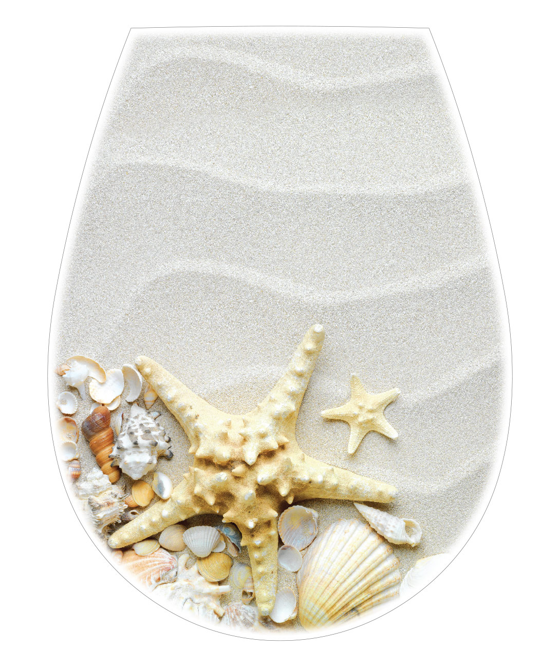Deska sedesowa do WC marki Bisk dzięki grafice w postaci piasku, kamyków i muszelek, doda łazience wyjątkowego charakteru. W bardzo łagodny sposób ożywi wnętrze ubikacji oraz w połączeniu z zapachem morskiej bryzy, pozwoli myślami przenieść się na plażę.