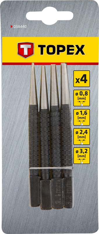 Dobijaki do gwoździ TOPEX (nr ref. 03A440) służą do precyzyjnego dobijania gwoździ uprzednio wbitych w materiał. Uniwersalne rozmiary zawarte w komplecie sprawiają, że zestaw jest użyteczny podczas większości prac. Marka TOPEX skierowana jest do majsterkowiczów.