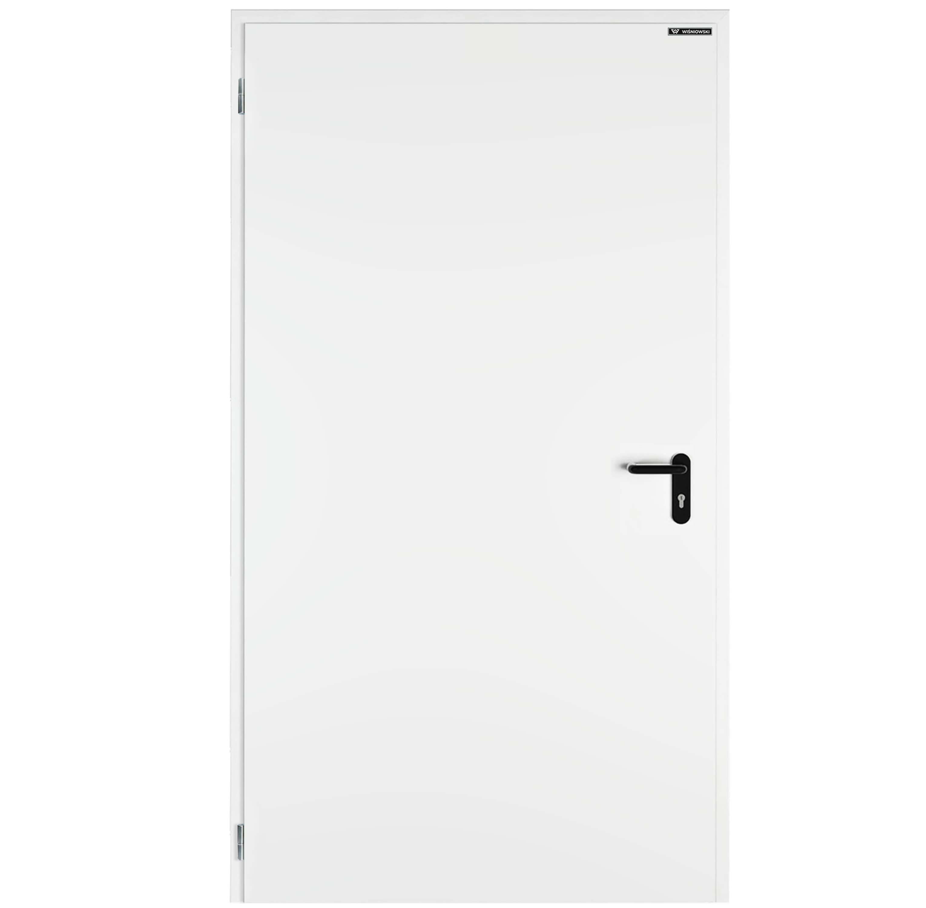 Drzwi zewnętrzne jednoskrzydłowe pełne. Wykonane z blachy stalowej ocynkowanej 0,5 mm, powlekanej powłoką poliestrową. Ościeżnica wykonana z kształtowników stalowych ocynkowanych malowanych proszkowo. Skrzydło drzwi jest wypełnione styropianem, płytą PU lub kartonem (plaster miodu).