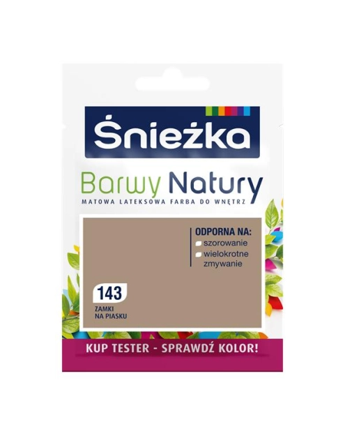 ŚNIEŻKA Barwy Natury Tester służy do próbnego wymalowania i przetestowania koloru na sztywnej kartce papieru lub na fragmencie ściany. To matowa, lateksowa farba do ścian wewnątrz pomieszczeń. Tworzy trwałą, paroprzepuszczalną powłokę, która zapewnia oddychanie ścian. Powierzchnie pomalowane emulsją Śnieżka Barwy Natury są odporne na zabrudzenia i wielokrotne zmywanie. Farba charakteryzuje się trwałością kolorów, wysoką wydajnością i dużą siłą krycia. Farba jest bezpieczna dla użytkowników i pozostawia piękne dekoracyjne wykończenie malowanych powierzchni tynkowanych, betonowych, gipsowych, drewnianych i drewnopochodnych.