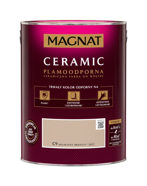 Nowoczesna farba ceramiczna MAGNAT Ceramic to oryginalny polski produkt odpowiadający najwyższym światowym standardom w zakresie malowania wnętrz. MAGNAT Ceramic to połączenie wysokiej jakości żywic i pigmentów z ceramicznymi komponentami, co sprawia że farba jest plamoodporna i przygotowana do częstego zmywania i szorowania nawet przy użyciu środków dezynfekujących bez ryzyka utraty kolorów. Nie chlapie podczas malowania, ma doskonałą wydajność i bardzo dobrze kryje powierzchnię już przy pierwszej warstwie. Farba ceramiczna MAGNAT zapewnia najwyższą jakość i głębię barw, tworząc długotrwałe efekty dekoracyjne.