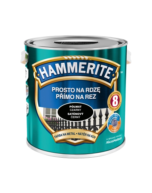 Hammerite Prosto Na Rdzę – efekt półmatowy – to nowoczesna, jednoskładnikowa farba, schnąca na powietrzu, przeznaczona do antykorozyjnego i dekoracyjnego malowania metali żelaznych (stal, żeliwo), zarówno tych pokrytych rdzą, jak i czystych. Może być również stosowana do zabezpieczenia metali nieżelaznych po odpowiednim zagruntowaniu. Wykończenie w efekcie półmatowym zapewnia niepowtarzalne walory estetyczne i długotrwałą ochronę antykorozyjną.