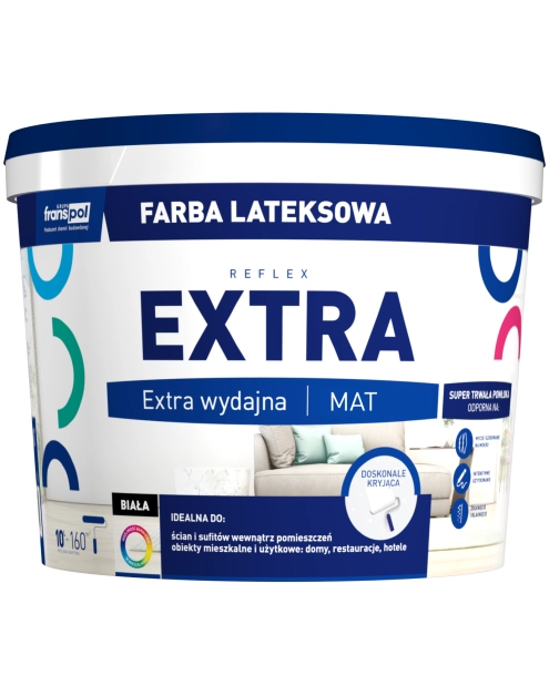 Farba do wnętrz Reflex extra 10l Frans-pol to wysokiej jakości produkt przeznaczony do malowania ścian i sufitów w pomieszczeniach mieszkalnych i biurowych.