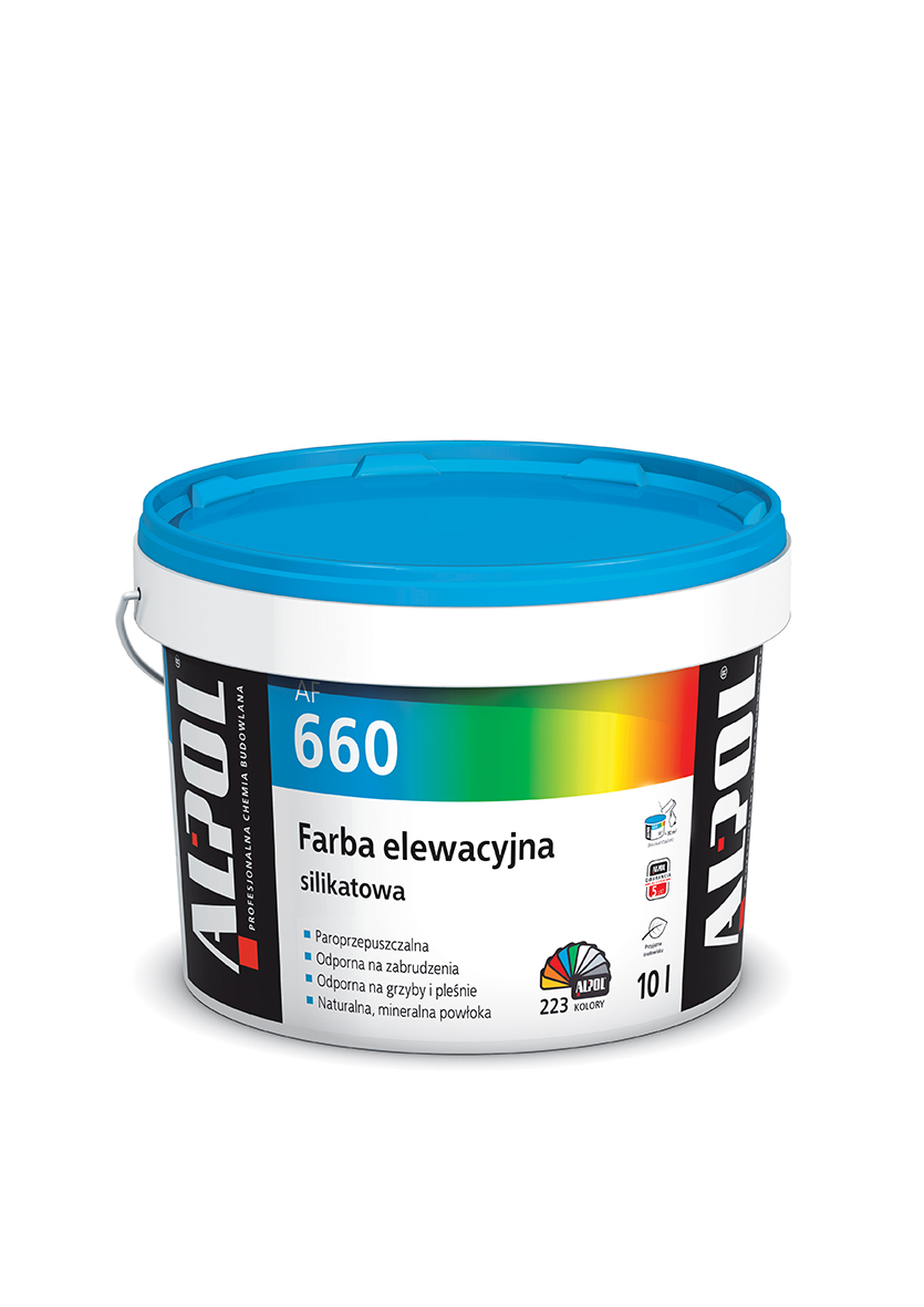 Farba elewacyjna silikatowa 10 L AF660 marki ALPOL to produkt o dużej sile krycia, uszlachetniona dodatkami chroniącymi przed nadmiernym przyjmowaniem wody. Tworzy trwałą i matową powłokę o wysokiej odporności na zabrudzenia oraz negatywny wpływ czynników atmosferycznych. Wyróżnia się bardzo wysoką przepuszczalnością dla powietrza, pary wodnej i CO2 oraz wyjątkową odpornością na mikroorganizmy. Elewacyjna farba silikatowa przeznaczona jest do wykonywania powłok dekoracyjno - ochronnych na zewnątrz budynków na typowych podłożach budowlanych, jak i do renowacji powierzchni pokrytych tynkami cienkowarstwowymi. Charakteryzuje się bardzo wysoką siłą krycia oraz odpornością na ścieranie.