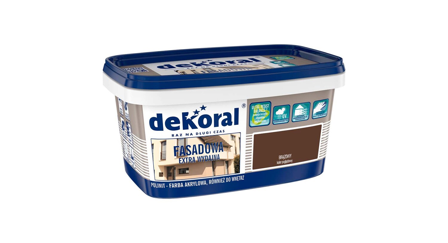 Farba fasadowa Polinit marki Dekoral to wydajny środek, który zapewni idealne krycie fasad budynków. Farba jest przeznaczona do malowania różnego typu tynków: gipsowych, cementowych i cementowo wapiennych. Preparat sprawdza się także do pokrywania powierzchni betonowych lub ceglanych. Farba fasadowa cechuje się podwyższoną odpornością na działanie zmiennych czynników atmosferycznych – wilgoci, niskich i wysokich temperatur oraz silnego nasłonecznienia. Farba jest też odporna na szorowanie – w razie powstania mocnych zabrudzeń fasadę można łatwo umyć. Szacunkowa wydajność preparatu to ok. 12 m2 na litr.
