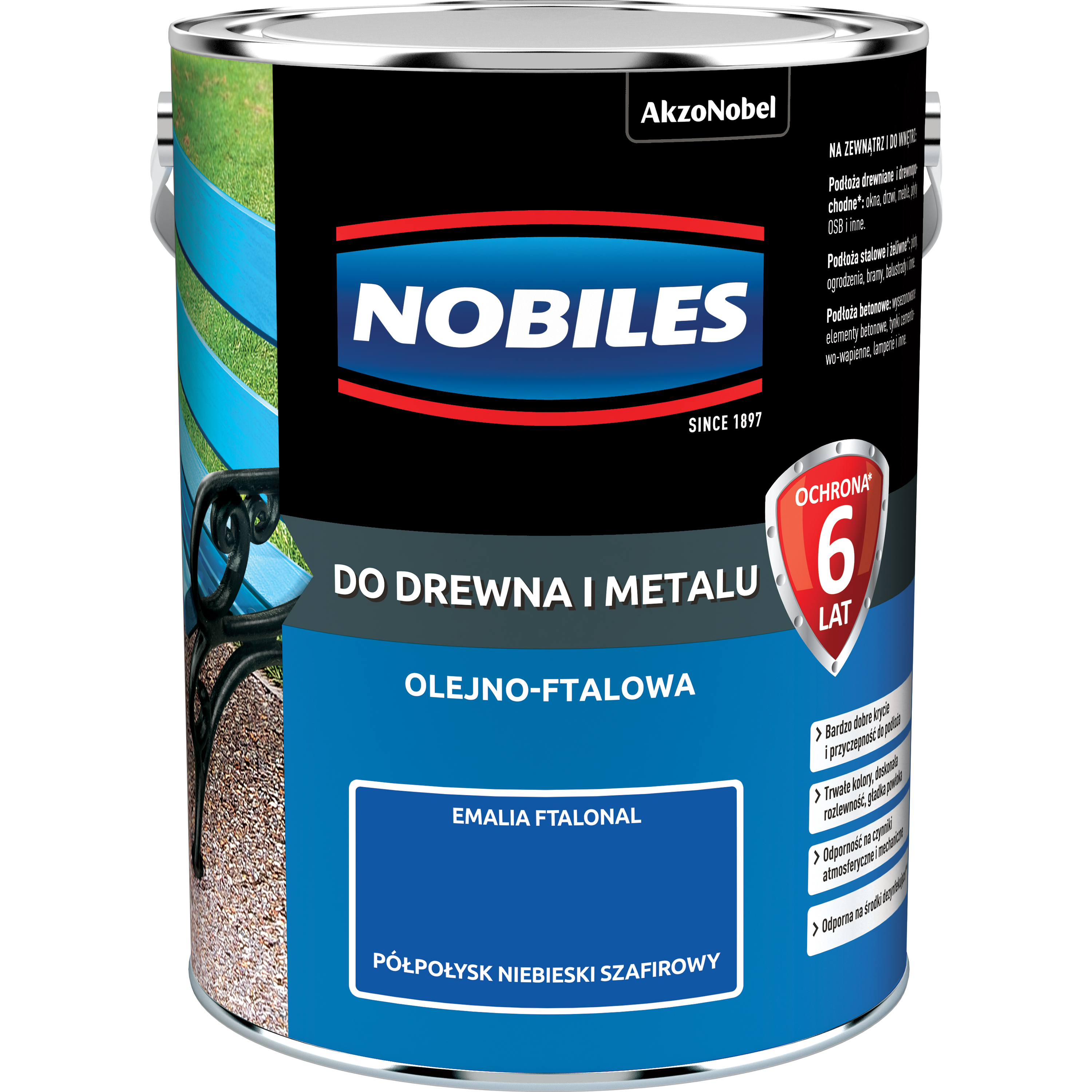 Nobiles Do Drewna i Metalu Ftalonal to nawierzchniowa farba alkidowa, dająca powłoki charakteryzujące się dobrą przyczepnością do podłoża, elastycznością oraz dobrą odpornością na czynniki atmosferyczne. Nobiles Ftalonal to farba do ochronnego i dekoracyjnego malowania powierzchni: stalowych, żeliwnych, drew-nianych, betonowych oraz tynków cementowo – wapiennych pokrytych uprzednio farbami podkładowymi lub antykorozyjnymi. Służy do malowania np. elementów metalowych balkonów, malowania elementów drewnianych altan czy lamperii na tynkach cementowo – wapiennych. Może być stosowana we-wnątrz i na zewnątrz obiektów. - gwarancja 6 lat ochrony - bardzo dobre krycie - trwałość kolorów - wyjątkowa odporność na czynniki atmosferyczne