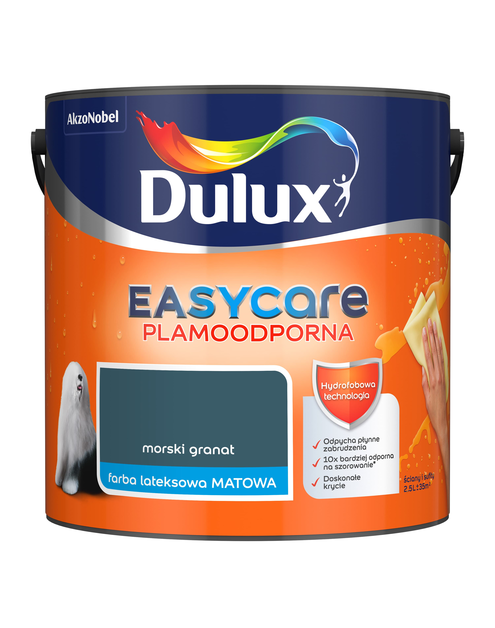Farba lateksowa EasyCare marki DULUX to idealny wybór dla osób ceniących jakość oraz trwałość. Produkt charakteryzuje się hydrofobowymi właściwościami, które odpychają płynne zabrudzenia i plamy. Farba zapewnia doskonałe krycie i wykazuje wysoką odporność na szorowanie. Kolor Morski granat idealnie sprawdzi się w nowoczesnych i awangardowych wnętrzach.