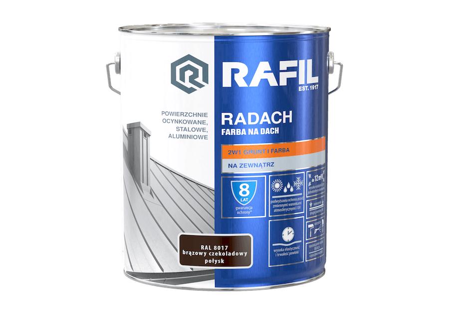 RAFIL Radach Farba na Dach to gruntoemalia szczególnie polecana do renowacji: dachów, rynien i parapetów. Tworzy wyjątkowo trwałą i elastyczną powłokę, która chroni przed szkodliwym działaniem promieniowania UV, wysokimi i niskimi temperaturami, opadami, uderzeniami gradu, czy osadami z zanieczyszczonego powietrza. Gruntoemalia RAFIL Radach może być stosowana samodzielnie lub w zestawie z Podkładem Antykorozyjnym RAFIL. Użycie farby zgodnie z instrukcją producenta zapewnia 8 lat gwarancji ochrony. Warunki gwarancji dostępne na www.rafil.pl.