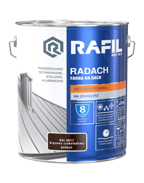 RAFIL Radach Farba na Dach to gruntoemalia szczególnie polecana do renowacji: dachów, rynien i parapetów. Tworzy wyjątkowo trwałą i elastyczną powłokę, która chroni przed szkodliwym działaniem promieniowania UV, wysokimi i niskimi temperaturami, opadami, uderzeniami gradu, czy osadami z zanieczyszczonego powietrza. Gruntoemalia RAFIL Radach może być stosowana samodzielnie lub w zestawie z Podkładem Antykorozyjnym RAFIL. Użycie farby zgodnie z instrukcją producenta zapewnia 8 lat gwarancji ochrony. Warunki gwarancji dostępne na www.rafil.pl.