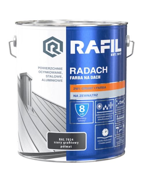 RAFIL Radach Farba na Dach to gruntoemalia szczególnie polecana do renowacji: dachów, rynien i parapetów. Tworzy wyjątkowo trwałą i elastyczną powłokę, która chroni przed szkodliwym działaniem promieniowania UV, wysokimi i niskimi temperaturami, opadami, uderzeniami gradu, czy osadami z zanieczyszczonego powietrza. Gruntoemalia RAFIL Radach może być stosowana samodzielnie lub w zestawie z Podkładem Antykorozyjnym RAFIL. Użycie farby zgodnie z instrukcją producenta zapewnia 8 lat gwarancji ochrony. Warunki gwarancji dostępne na www.rafil.pl.