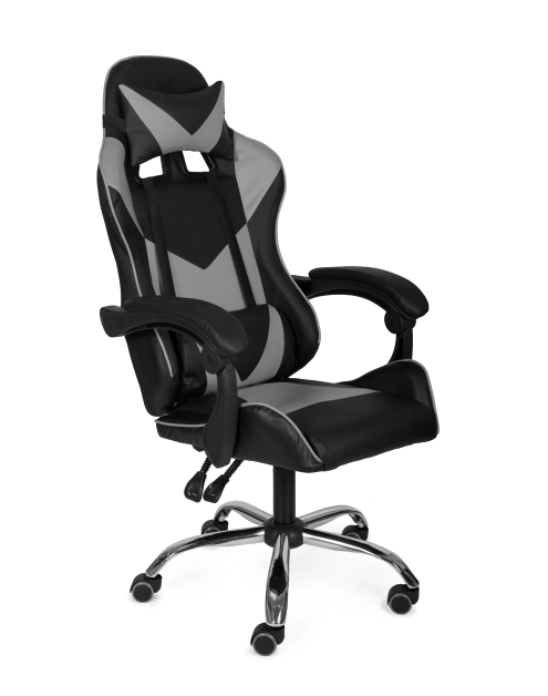 Fotel gamingowy tapicerowany ekoskórą, wyposażony w mechanizm kołysania się 2-dźwigniowy pozwalający na blokadę fotela w pozycji do pracy i wychelenie do 130 stopni, kółka z oponką do twardych powierzchni nie rysujące podłogi, podłokietniki z tapicerowanymi nakładkami,, podstawa racingowa, poduszki zdejmowane podpierające lędźwie oraz odcinek szyjny kręgosłupa.