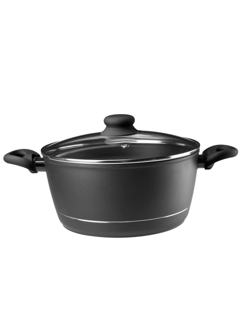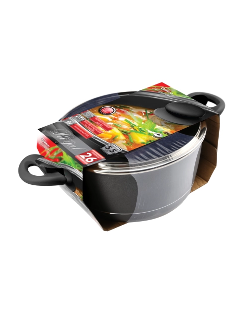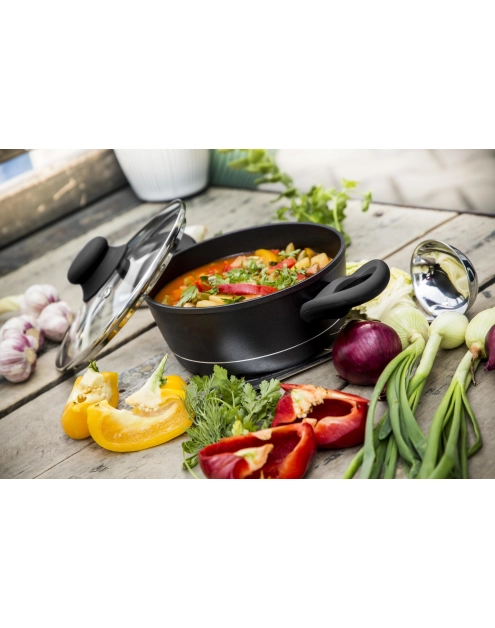 Atrakcyjną propozycją do nowoczesnej kuchni jest linia Royal do której dołączyły ostatnio funkcjonalne i estetyczne garnki w trzech pojemnościach: 1,7 l, 2,5 l i 4,5 l. Jej charakterystyczną cechą są czerwone elementy; ergonomiczne, powlekane silikonem rączki w patelniach i uchwyty w garnkach. Czarna barwa w połączeniu z czerwonymi idealnie wyprofilowanymi detalami, podkreślającymi ładny wygląd naczyń sprawia, iż są one wspaniałą ozdobą wnętrza. Patelnie i garnki posiadają solidne grube ścianki i dno, które wraz z wewnętrzną powierzchnią pokryte jest nieprzywieralną powłoką zapewniającą wygodę użytkowania.  Przeznaczone są do wszystkim rodzajów kuchenek, również indukcyjnych. Garnki zaopatrzono w funkcjonalne i dekoracyjne szklane pokrywy zwieńczone czerwonym uchwytem. Całość tworzy wspaniałą kuchenną kompozycję zachwycającą estetyką, pięknym wykończeniem i wysokiej jakości materiałami. Wymiary: Średnica: 26 cm. Pojemność: 5,5l Wysokość: 13cm
