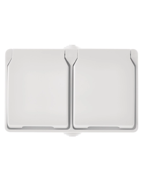 produkt: gniazdo podwójne ze stykami ochronnymi, pokrywką i przyłączem, design: FRENCH, typ: 250 V~/16 A max., kolor: biały, sposób montażu: na ścianę, stopień ochrony: IP44, rodzaj: podwójne wodoodporne, opakowanie: 1 szt., woreczek PE, okres gwarancyjny: 2 lata