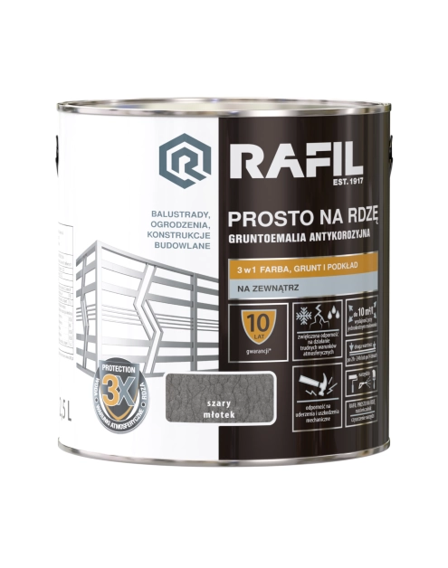 RAFIL Prosto Na Rdzę to antykorozyjna, szybkoschnąca gruntoemalia 3w1 przeznaczona do stosowana bezpośrednio na zardzewiałe powierzchnie metalowe na zewnątrz. Tworzy niezwykle trwałą i elastyczną powłokę odporną na uderzenia i uszkodzenia mechaniczne. Unikalna technologia Protection 3X odpycha wodę, chroni przed zmiennymi warunkami atmosferycznymi i zapobiega powstawaniu rdzy. Gwarancja 10 lat skutecznej ochrony została potwierdzona Krajową Oceną Techniczną. Warunki gwarancji dostępne na www.rafil.pl