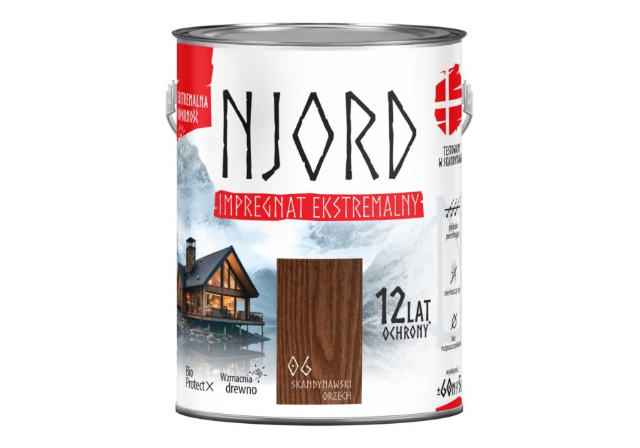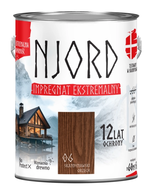 Impregnat Ekstremalny Njord to nowa jakość w ochronie i pielęgnacji drewna. Podkreśla jego naturalne piękno, wydobywając rysunek słojów. Formuła produktu zapewnia bardzo łatwą aplikację, szybkie schnięcie oraz estetyczny wygląd na lata bez efektu łuszczenia się powłoki. Zabezpiecza drewno przed szkodliwym działaniem czynników atmosferycznych, jak promieniowanie UV oraz opady. Dzięki technologii Bio ProtectX tworzy hydrofobową powłokę, odporną również na działanie grzybów i glonów. Opracowany w oparciu o warunki skandynawskie, wzmacnia drewno zapewniając nawet do 12 lat ochrony. W dbałości o zdrowie użytkowników, komfort pracy, a także środowisko naturalne Impregnat Ekstremalny nie zawiera szkodliwych rozpuszczalników.