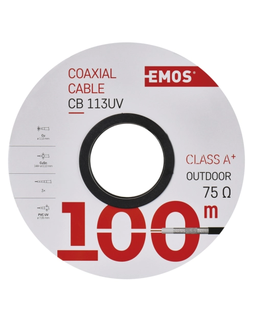 Typ kabla koncentrycznego: CB113UV, impedancja: 75 Ohm, zastosowanie: instalacja zewnętrzna, instalacje abonenckie, odporność na promieniowanie UV, do zastosowań zewnętrznych, materiał żyły wewnętrznej: miedź (Cu), średnica żyły wewnętrznej: 1,13 mm, typ dielektryka, średnica: FPE 4,8 mm, ilość ekranów: 3, ekran I. folia: 1x Al/PES, materiał ekranu: cynowana miedź (CuSn), ilość drucików w ekranie: 144x 0,12 mm, średnica ekranu: 144x 0,12 mm2, pokrycie ekranem: >84 %, ekran II. folia: Al/taśma spiralna, średnica płaszcza kabla: 7,05 mm, materiał płaszcza kabla: PCV odporne na UV, kolor płaszcza: czarny, pojemność (pF/m): 52, współczynnik skrócenia fali: 0,84, maksymalne tłumienie przy 20 st.C (dB/100m) 10 MHz: 2,28, maksymalne tłumienie przy 20 st.C (dB/100m) 100 MHz: 5,8, maksymalne tłumienie przy 20 st.C (dB/100m) 450 MHz: 12,8, maksymalne tłumienie przy 20 st.C (dB/100m) 650 MHz: 15,1, maksymalne tłumienie przy 20 st.C (dB/100m) 860 MHz: 17,87, maksymalne tłumienie przy 20 st.C (dB/100m) 1 000 MHz: 19,5, maksymalne tłumienie przy 20 st.C (dB/100m) 2 000 MHz: 28,2, minimalne tłumienie odbić przy 20 st.C (dB) 300-600 MHz: 25, minimalne tłumienie odbić przy 20 st.C (dB) 600-900 MHz: 23, minimalne tłumienie ekranu (dB) 10 ~ 800 MHz: >95, maksymalna rezystancja dla prądu stałego przy 20 st.C (Ohm/km) - rdzeń wewnętrzny: 25,7, maksymalna rezystancja dla prądu stałego przy 20 st.C, (Ohm/km) - rdzeń zewnętrzny: 45,9, rezystancja izolacji między żyłami przy 20 st.C (MOhm/km): 500, minimalny promień gięcia jednorazowy/wielokrotny: 30/60 mm, ciężar (kg/km): 43,5, minimalne tłumienie odbić przy 20 st.C (dB) 10-300 MHz: 31, temperatura przechowywania: -20 st.C do +75 st.C, temperatura użytkowania: +5 st.C do +60 st.C, ilość na szpuli: 100 m, typ szpuli: papierowa szpula, oznaczenie metrów: 1-100 m, zalecane typy złącz - F zaciskane: *K7220, zalecane typy złącz - F skręcane: *K7351, FPE = dielektryk piankowy, klasa reakcji na ogień: Eca, substancje niebezpieczne: nie, opakowanie: 100 m, szpula, okres gwarancyjny: 5 lat