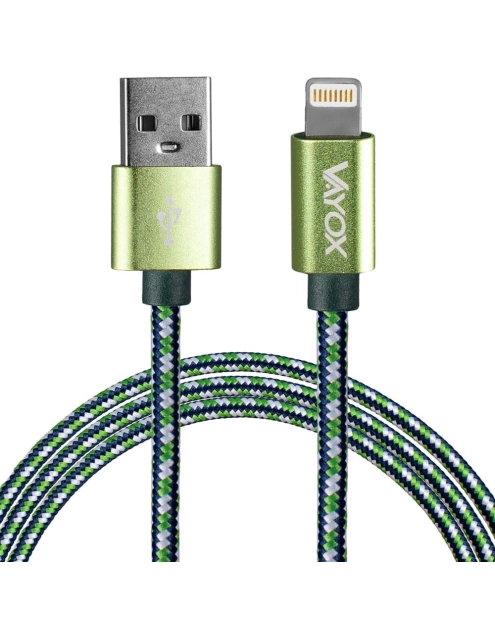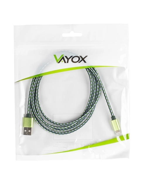 Kabel USB - Lightning VA0147 w zielonym kolorze o długości 1,5 metra od Vayox charakteryzuje się wysoką jakością wykonania oraz nierdzewnymi złączami. Posiada nylonowy oplot, co zwiększa jego trwałość i odporność na uszkodzenia.