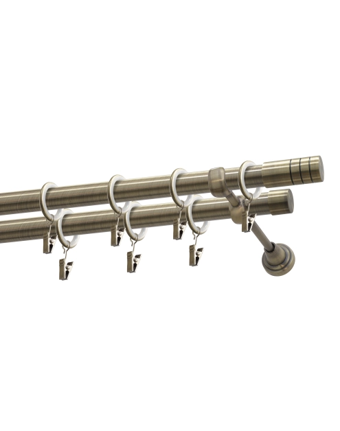 Karnisz podwójny Zylinder 320 cm marki Gardinia w kolorze mosiądzu to powszechnie wybierany rodzaj dekoracji okna. Z jego pomocą możesz powiesić dowolne zasłony i firany, które tworzą unikalną aranżację pomieszczenia oraz osłonić się przed ciekawskimi spojrzeniami sąsiadów. Wykonany z najwyższej jakości metalu karnisz marki Gardinia jest trwały, odporny na uszkodzenia mechaniczne, rdzewienie, korozję oraz łatwy w utrzymaniu czystości. Montowany jest do różnego rodzaju ścian za pomocą mocnych, otwartych wsporników. Rurka karnisza Zylinder charakteryzuje się grubymi ściankami, zapewniając komfort i bezpieczeństwo użytkowania. Dodatkowo w zestawie znajdują się wytrzymałe żabki na kółkach oraz ozdobne zakończenia w kształcie cylindra.